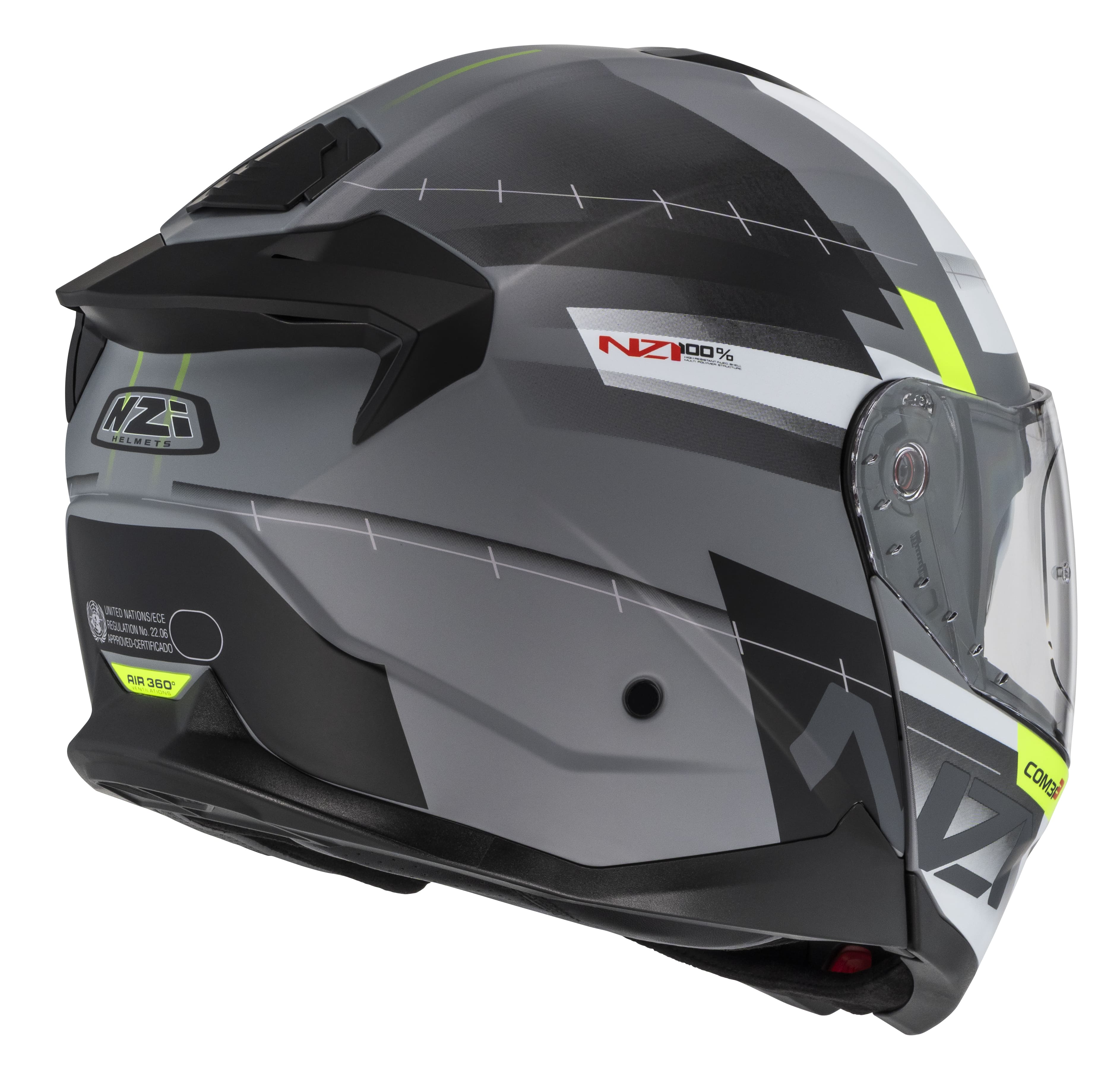Capacete modular em termoplástico, com viseira solar, fecho micrométrico, ventilado, com interior removível e lavável, viseira termoformada de alta resistência, com tratamento anti risco. HOLOGAÇÂO 2206