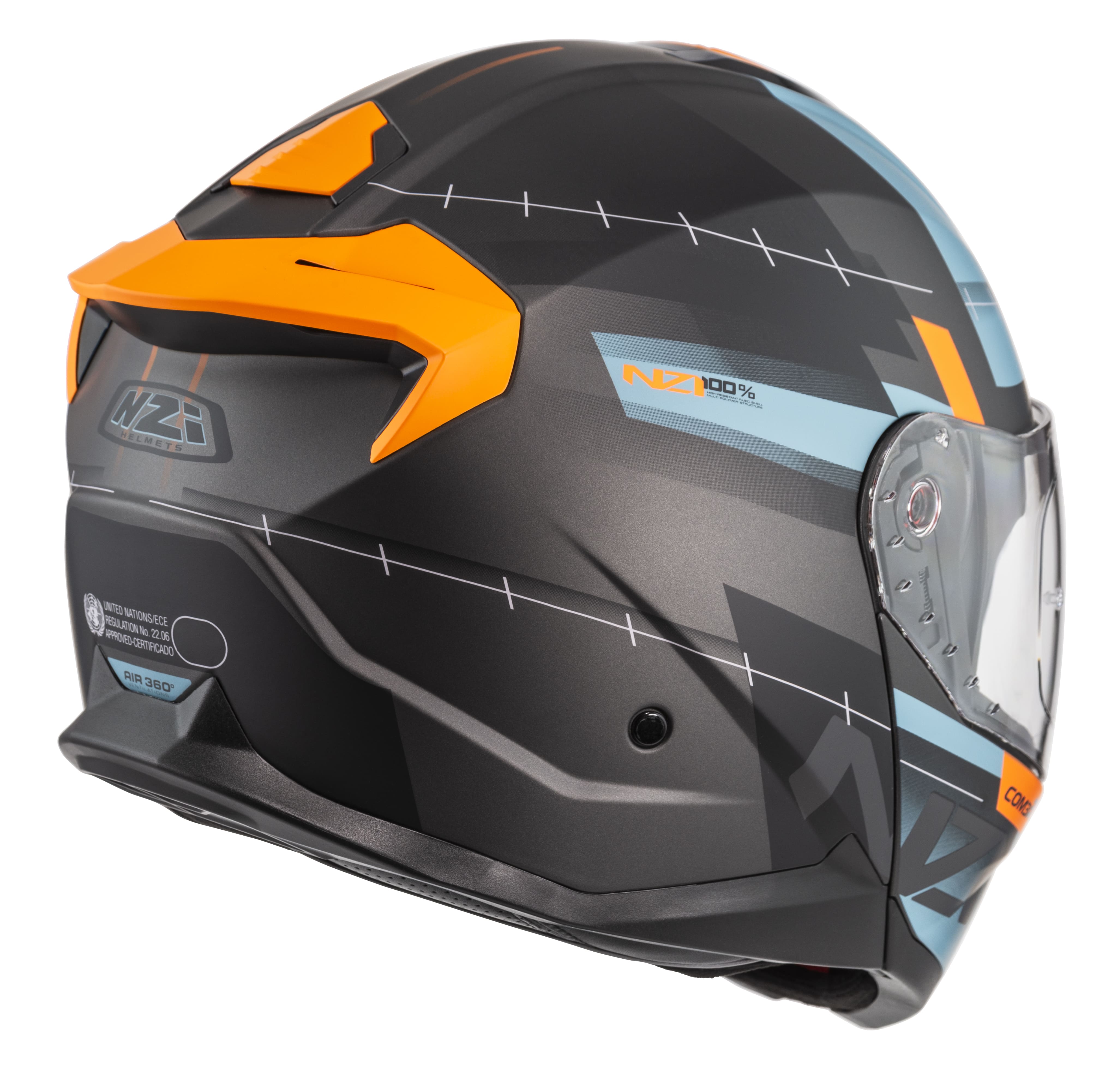Capacete modular em termoplástico, com viseira solar, fecho micrométrico, ventilado, com interior removível e lavável, viseira termoformada de alta resistência, com tratamento anti risco. HOLOGAÇÂO 2206